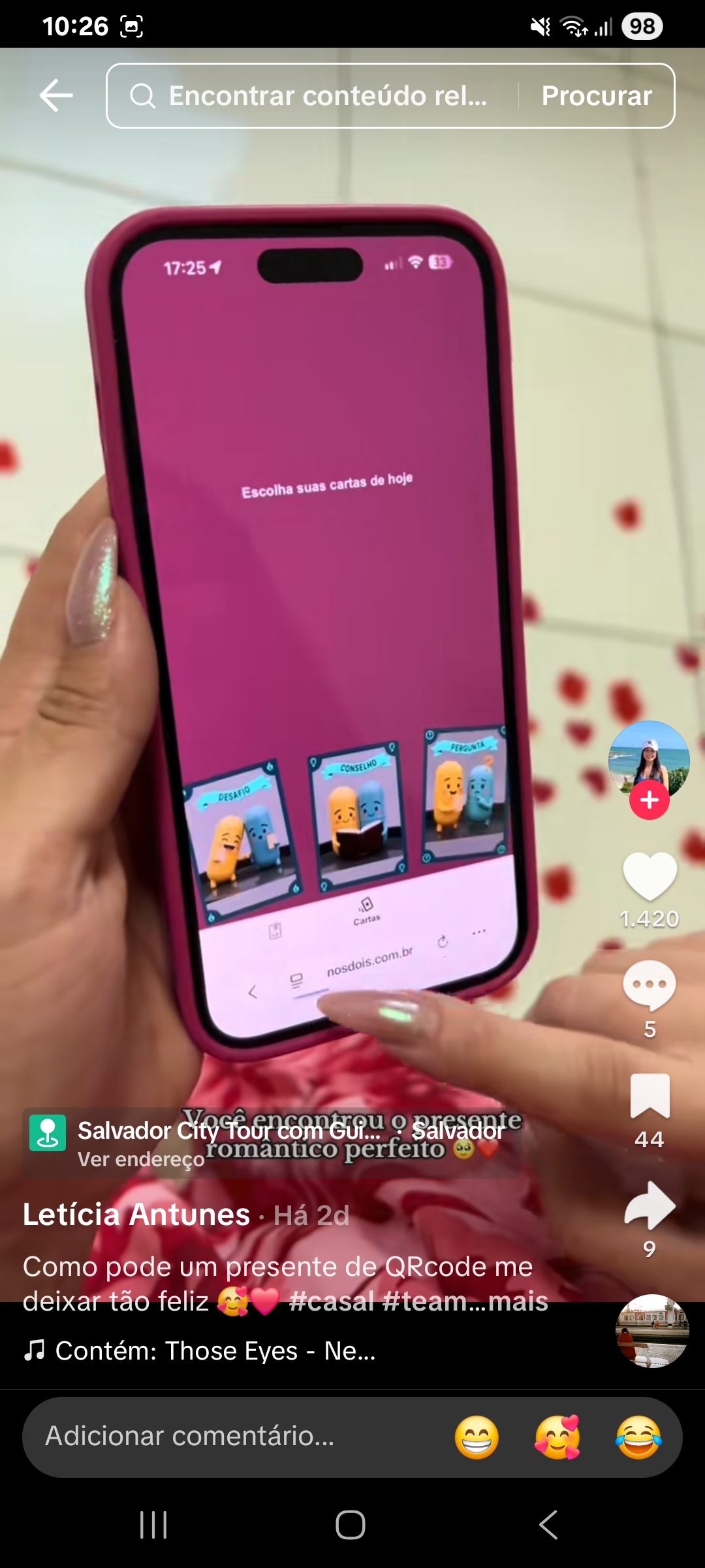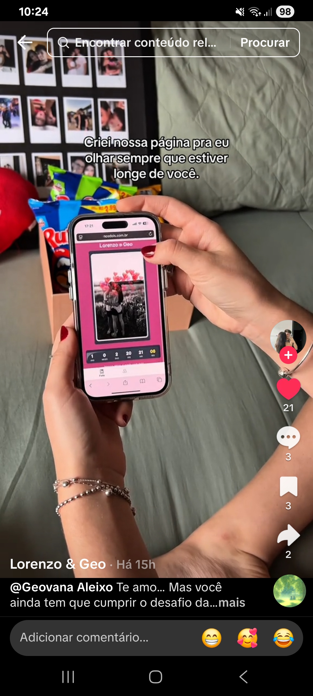 Nós dois é uma plataforma que permite criar páginas personalizadas de relacionamento para casais e um jogo de 35 cartas. Você pode adicionar fotos, uma mensagem especial e um contador que mostra há quanto tempo vocês estão juntos. Perfeito para presentes surpresa.